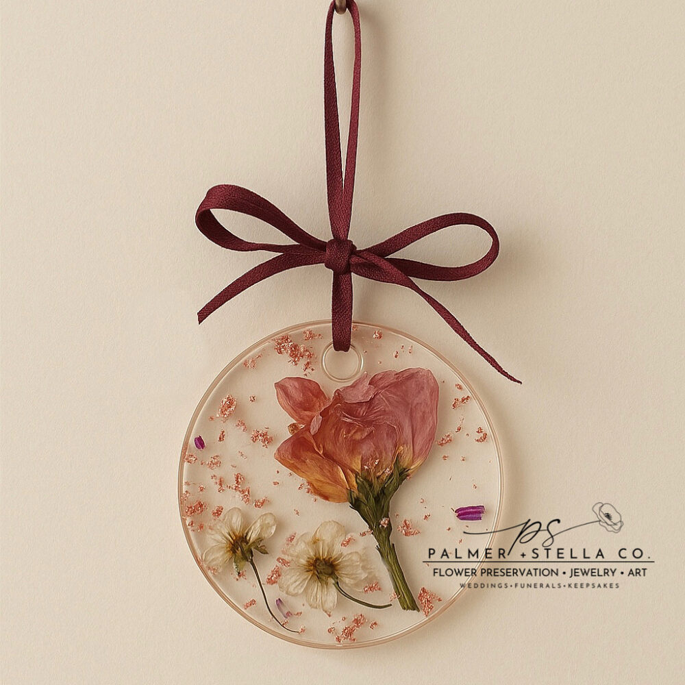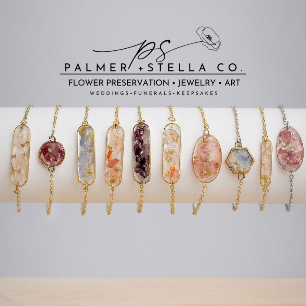Palmer + Stella Co. helps you keep a piece of your wedding day forever! We take your bouquet and turn it into one-of-a-kind keepsakes—like resin art, jewelry, and decor—so your flowers stay as beautiful as the memories they hold. Because some flowers are just too special to let go of.